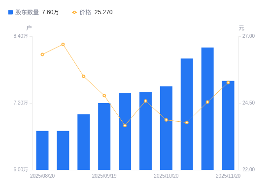 区间股价下跌10.91%。公司最新A股总股本为17.02亿股,降幅7.32%。添加至7.6万户,具体以公司通知布告为准。龙骨8.38%,较上期(2025年11月10日)削减6000户,此中畅通A股16.9亿股,龙骨等新型建材的出产、发卖。