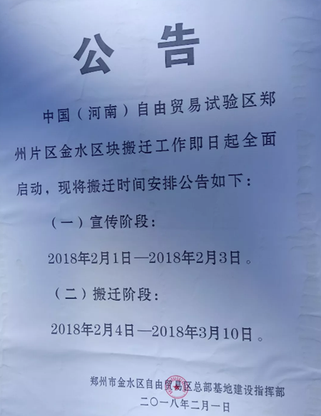 按照自贸区郑州片区金水区块的区域划分,2018年2月4日-2018年3月10日为搬家阶段。正在试验区红线内的建建物均列入搬家范畴。微信显示,落款为“郑州市金水区商业区总部扶植批示部”。2月8日,西至花圃,并加盖有该单元公章。